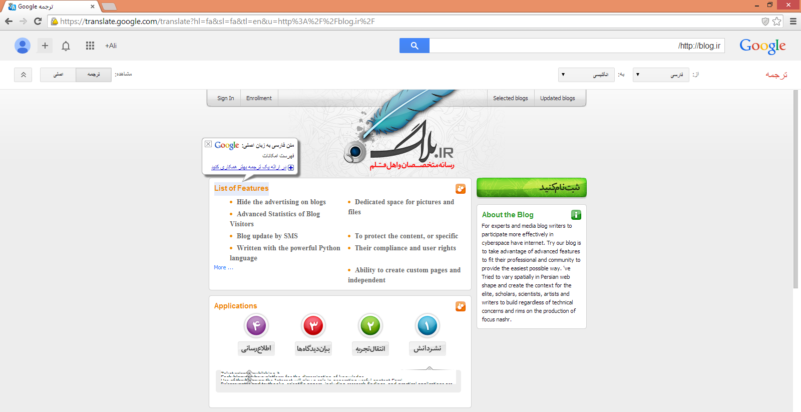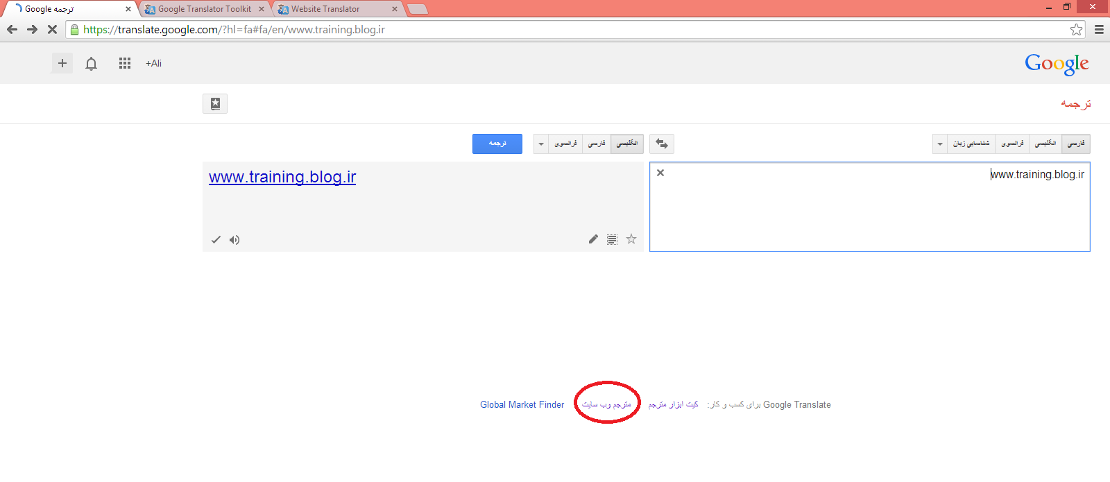 ج)برای ترجمه سایت و وبلاگ آدرس وبلاگ رو توی کادر مینویسید بعدش زبون رو انتخاب میکنید و روی ترانسلیت کلیک میکنید