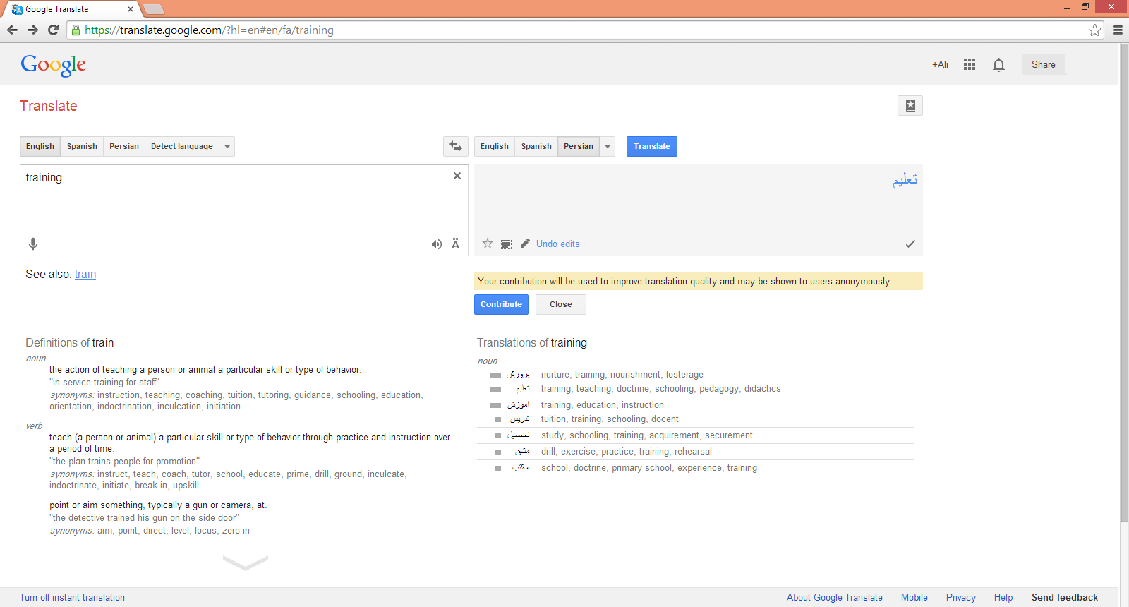 الف)برای این که متن رو ترجمه کنید ابتدا اونو مینویسید توی کادر زبون رو انتخاب میکنید صبر میکنید اگه خودش ترجمه کرد(instant) که هیچی اگه ترجمه نشد روی گزینه ترانسلیت(ترجمه ) کلیک میکنید و متنتون ترجمه میشه به همین سادگی